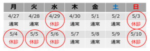 ゴールデンウィーク期間は暦通り(カレンダー通り)のお休みとなります。